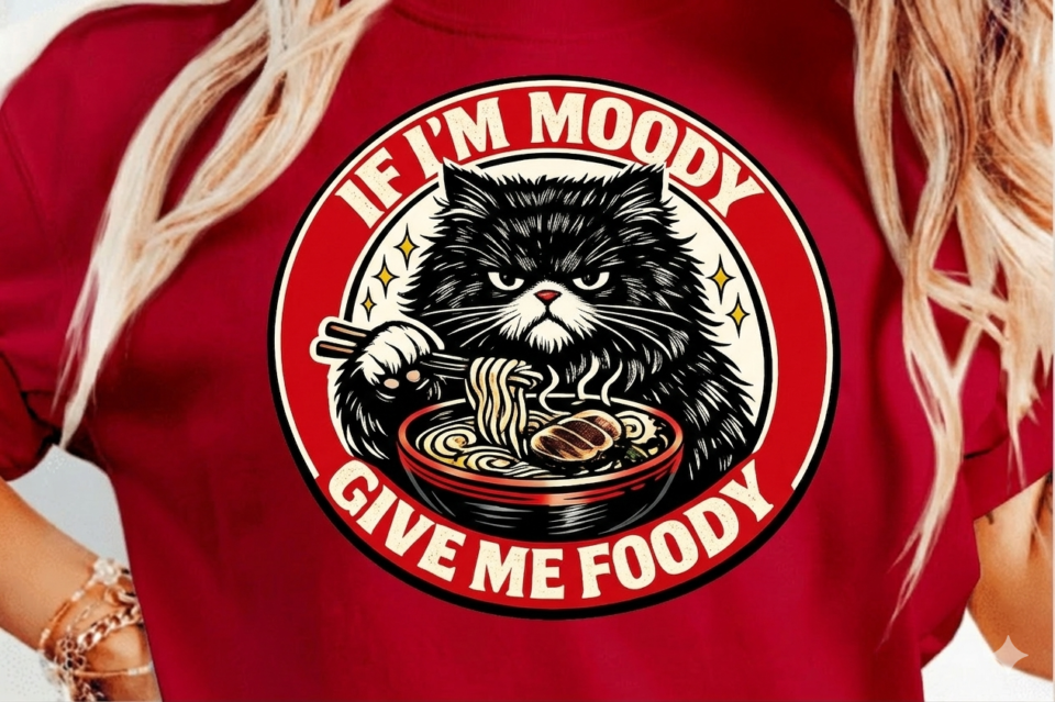 Turn that frown upside down with the “Moody Cat Ramen” collection, a visual tribute to everyone who understands the transformative power of a good bowl of noodles. This artwork features an expressive, disgruntled long-haired cat holding chopsticks and diving into a rich bowl of ramen, complete with swirling steam and savory toppings. The playful phrase “If I’m Moody Give Me Foody” is arched perfectly around the character, capturing a sentiment that resonates with foodies and pet owners alike. The high-contrast color palette of deep red, cream, and black gives the artwork a professional and timeless pop-art feel.